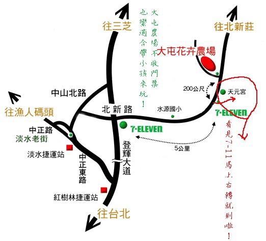 開車族:沿著大度路一直開,經過紅樹林之後,接到登輝大道,看到右方出現一家7-11後確認是否北新路,再右轉一直開(一小段山路),再看到一家7-11右轉就到囉!